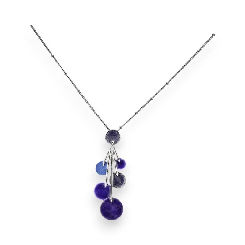 Le pendentif grappe de ce collier Ikita est un véritable bijou d'art. Composé de plusieurs éléments circulaires aux nuances violettes variées, il offre un jeu de lumière fascinant qui ne manquera pas d'attirer les regards. Chaque partie du médaillon reflète la lumière différemment, créant un effet scintillant et changeant selon vos mouvements. Cette combinaison de textures et de couleurs apporte une dimension unique à ce bijou fantaisie, le rendant parfait pour accessoiriser aussi bien une tenue de jour que de soirée.