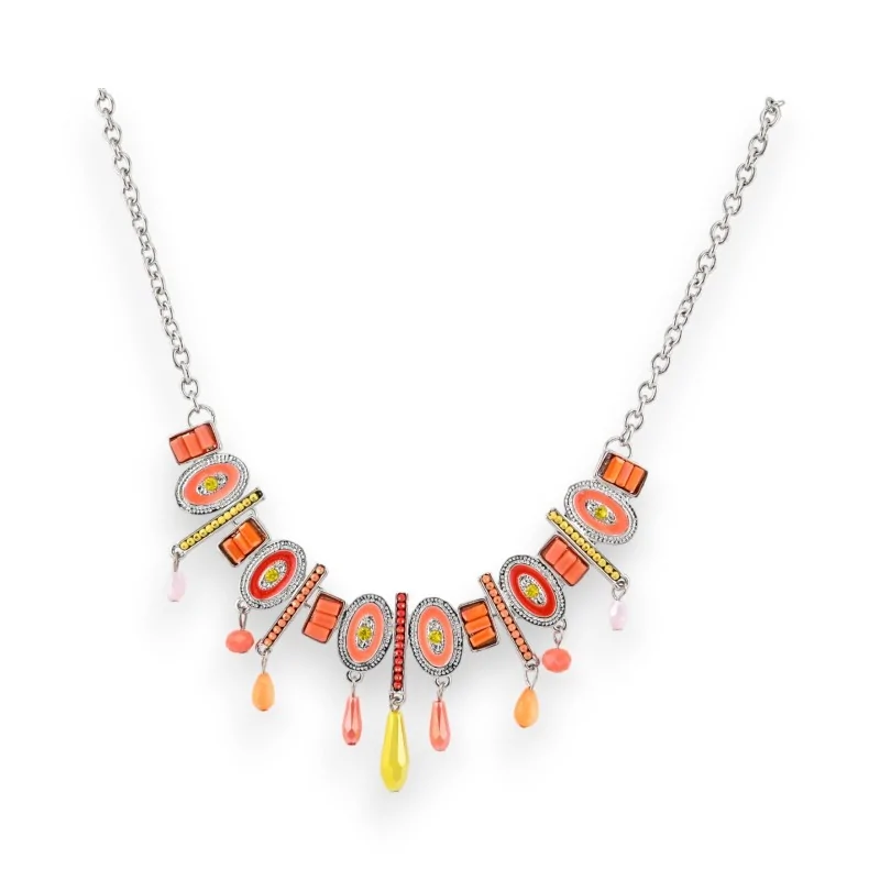 Ce collier fantaisie Ikita séduira les amatrices de bijoux originaux et colorés. Son pendentif argenté aux formes géométriques associe avec harmonie différentes nuances d'orange, du corail au mandarine. Les perles et gouttes suspendues ajoutent du mouvement et de la légèreté à l'ensemble. La finition argentée apporte une touche d'éclat et de raffinement. Un bijou lumineux qui illuminera votre visage et votre décolleté.