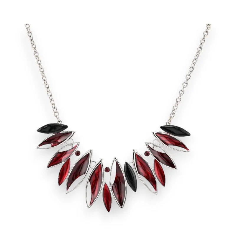 Ce collier fantaisie argenté et bordeaux offre de nombreuses possibilités de styling. Pour une allure sophistiquée, associez-le à une blouse en soie crème et un pantalon tailleur noir. Pour un look plus décontracté mais toujours chic, portez-le avec un pull à col roulé et un jean. N'hésitez pas à le superposer avec d'autres colliers plus fins pour créer un effet layering tendance. Ce bijou peut également être mis en valeur sur une peau nue avec un haut à épaules dénudées pour une touche de glamour lors d'une soirée. Quelle que soit la façon dont vous choisissez de le porter, ce collier Ikita apportera une dimension supplémentaire à votre tenue, attirant tous les regards par son design unique et sa combinaison de couleurs élégante.