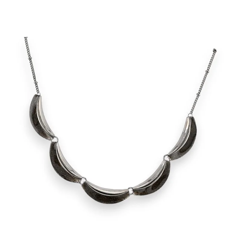 Le collier fantaisie Ikita se démarque par son design original et contemporain. Son pendentif en forme de demi-lune offre une silhouette graphique et épurée qui attire immédiatement le regard. La surface noire scintillante, parsemée de fines paillettes, apporte une touche de glamour et de féminité à ce bijou. Le contraste avec la chaîne en métal gris foncé crée un ensemble harmonieux et chic, parfait pour accessoiriser aussi bien une tenue de jour qu'une robe de soirée.