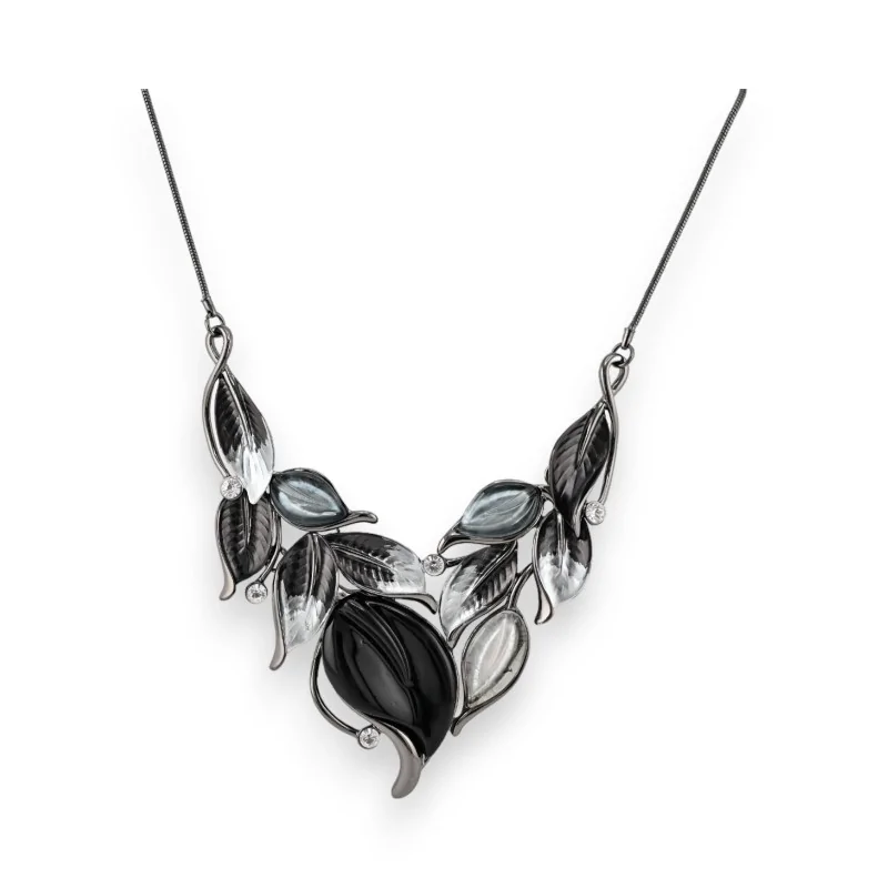 Ce superbe collier fantaisie de la marque Belle Miss arbore un design original et élégant de feuilles dans les tons noirs et gris. Réalisé en métal gris foncé, il mesure 24 cm de hauteur avec une rallonge de 5 cm pour s'adapter à toutes les morphologies. Cette très belle pièce de bijouterie saura sublimer vos tenues avec son style naturel et raffiné.