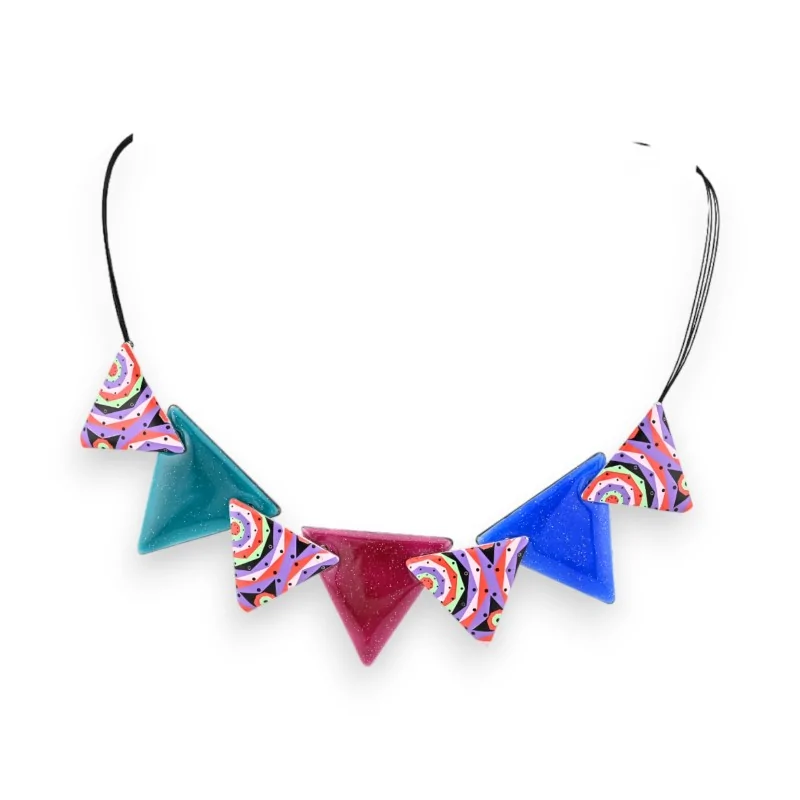 Le collier est monté sur un tour de cou en câble noir d'une longueur de 27 cm. Pour s'adapter à toutes les morphologies, il est équipé d'une rallonge de 6 cm permettant d'ajuster parfaitement la longueur. Cette conception permet de porter le collier de différentes façons, plus ou moins près du cou selon vos envies et vos tenues. Le câble noir apporte une touche d'élégance et met en valeur les couleurs vives des triangles. Sa finesse et sa souplesse assurent un excellent confort de port au quotidien.