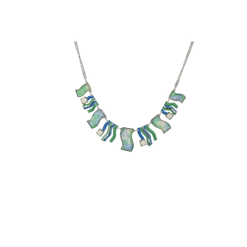 Ce collier fantaisie aux teintes bleu et vert est un véritable bijou d'exception. Inspiré par les reflets changeants de l'océan, il arbore de délicates nuances allant du bleu profond au vert émeraude. La combinaison harmonieuse de ces couleurs crée un effet visuel saisissant, rappelant les eaux cristallines d'une plage paradisiaque. Chaque élément du collier a été soigneusement conçu pour capturer la beauté et le mouvement de l'océan, offrant un accessoire à la fois élégant et empreint de naturel.