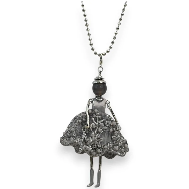 Collier avec pendentif poupée articulée en dentelle grise sur chaîne fine argentée Collier Poupée Dentelle Grise Articulée