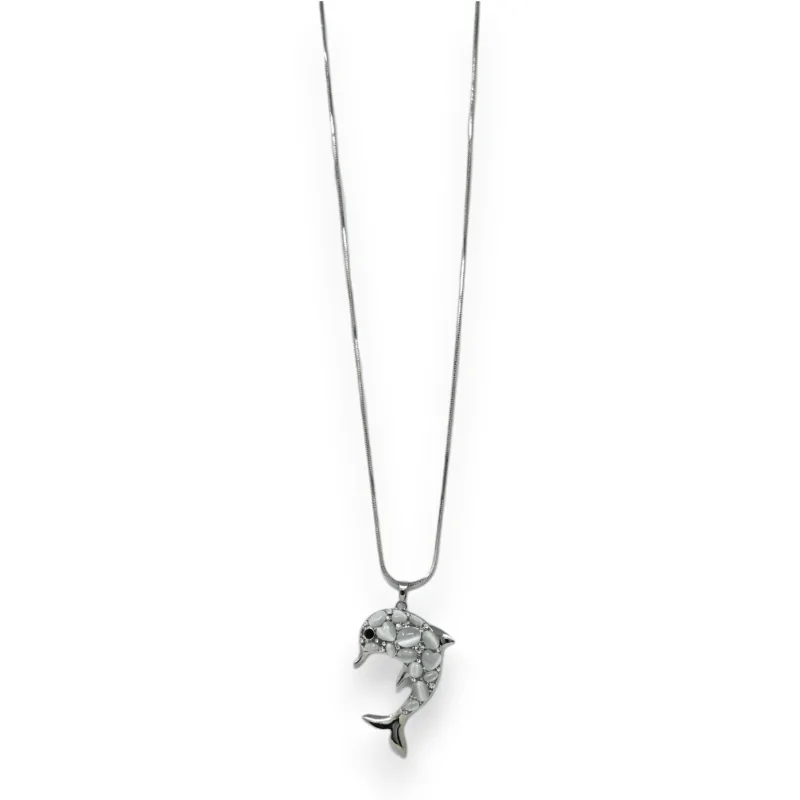 Plongez dans l'univers marin avec ce collier fantaisie mettant en lumière la grâce et la beauté d'un dauphin, l'une des créatures les plus aimées des océans. Le pendentif dévoile un dauphin finement travaillé, orné de pierres grises au magnifique effet nacré, rappelant le doux reflet de la lueur lunaire sur l'eau. Chaque pierre nacrée est harmonieusement accentuée par un ensemble de petits strass judicieusement placés, évoquant les éclats scintillants de l'eau sous le soleil. Le médaillon, mesurant avec précision 5 cm, est le point focal de ce bijou. Lorsqu'il est délicatement suspendu à sa chaîne élégamment conçue, la longueur totale du collier s'étend à 44,5 cm. Pour une touche de personnalisation et de confort, une chaînette adaptable est intégrée, vous offrant la possibilité d'ajuster le collier selon votre style et votre humeur du jour.