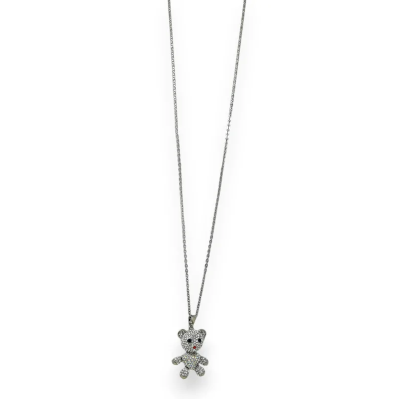 Offrez-vous une touche d'enfance et d'éclat avec ce collier fantaisie argenté, mettant à l'honneur un délicieux nounours. Ce pendentif, finement réalisé en strass blanc, brille de mille feux, capturant la lumière et l'attention. Détail unique et fascinant, le corps et les membres du nounours sont articulés, apportant une dimension de mouvement et de réalisme au bijou. Mesurant 3,5 cm, ce médaillon est à la fois discret et remarquable. Accompagné de sa chaîne élégante de 43 cm, il sied parfaitement à tout port de cou. De plus, une chaînette ajustable est intégrée pour vous offrir un confort sur-mesure. Un bijou à la fois nostalgique et moderne, idéal pour illuminer vos tenues.