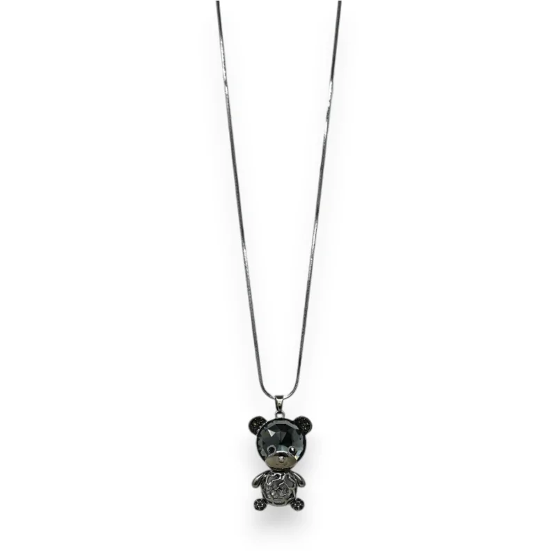 Plongez dans un univers d'enchantement avec ce collier fantaisie confectionné en métal gris foncé. Il met en avant la douce silhouette d'un bébé ourson, symbolisant tendresse et innocence. La tête de l'ourson, minutieusement façonnée avec une pierre facettée, capte la lumière et offre un relief éblouissant à cette création. Mesurant 4,5 cm, le médaillon se démarque par ses détails raffinés et son design unique. Il est délicatement suspendu à une chaîne d'une longueur de 42,5 cm, parfaitement ajustable grâce à une chaînette supplémentaire.