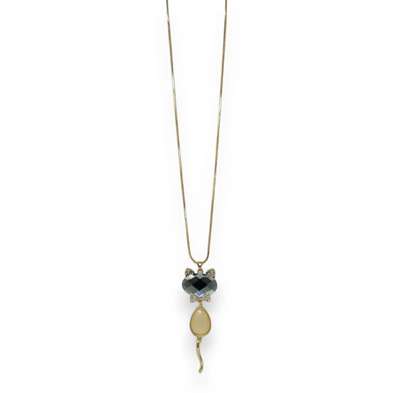 Sublimez votre allure avec ce collier fantaisie au fini doré, incarnant la grâce féline. Au centre de cette pièce d'exception se trouve un chat majestueux dont la tête est méticuleusement sculptée à partir d'une pierre grise facettée, brillant de mille éclats à chaque mouvement. Son corps, quant à lui, est finement dessiné en design épuré et est orné d'une délicate pierre beige à l'effet nacré, évoquant douceur et élégance. Mesurant 8,3 cm, le médaillon est une véritable prouesse artistique, fusionnant classicisme et modernité. Accroché à une chaîne délicate d'une longueur de 43,5 cm, ce bijou est aussi pratique qu'esthétique grâce à sa chaînette ajustable, permettant ainsi d'adapter sa longueur selon vos préférences et votre style. Une pièce incontournable pour les amoureux des chats et des bijoux raffinés.
