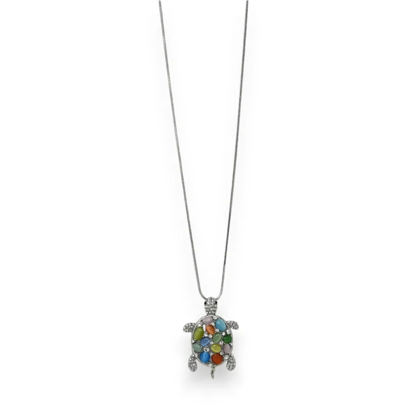 Sublimez votre tenue avec ce collier fantaisie en argent, mettant en vedette une tortue éclatante aux teintes multicolores. La carapace de la tortue, élaborée avec finesse et précision, est ornée de pierres soigneusement choisies qui se déclinent dans un kaléidoscope de couleurs, apportant un éclat joyeux et captivant. Cet éventail chromatique sert non seulement à rehausser le design, mais confère également au médaillon une présence dynamique et pétillante. Sa tête et ses membres délicats contrastent harmonieusement avec le corps multicolore, grâce à l'incrustation de strass blancs, apportant une luminosité supplémentaire et une touche d'élégance. Avec un médaillon de 6,5 cm, le collier atteint une longueur totale de 45 cm avec sa chaîne argentée, le rendant idéal pour orner votre cou.
