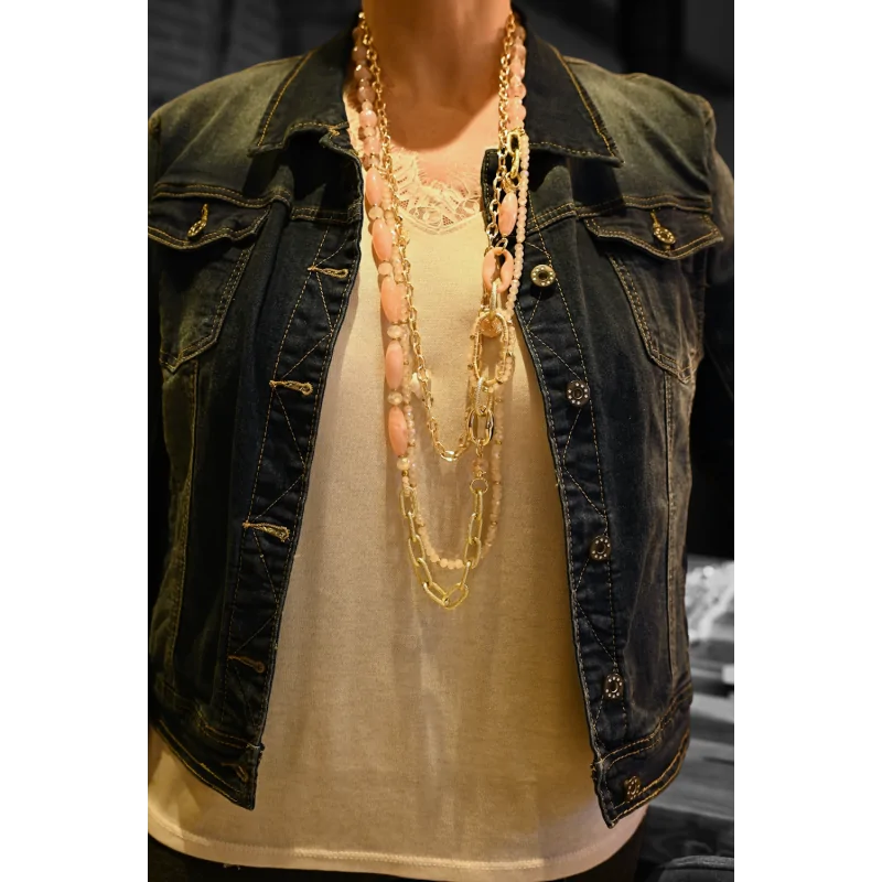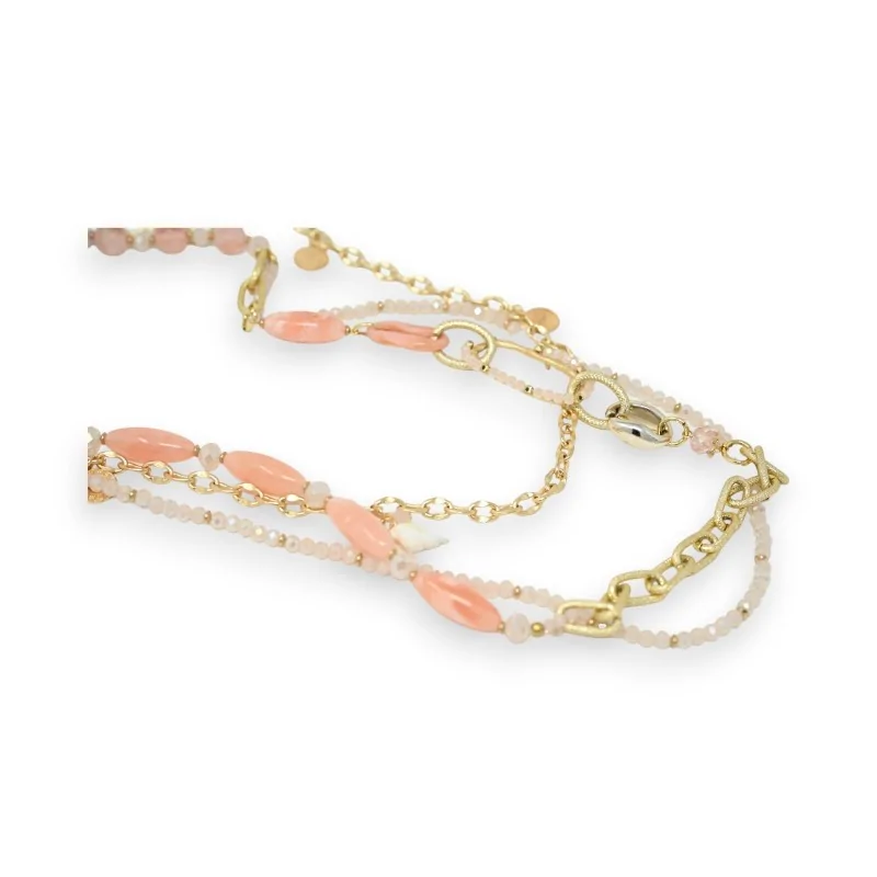 Ce collier sautoir fantaisie, d'une longueur de 51 cm, est une véritable ode à la liberté stylistique. Dans une harmonie de doré lumineux et de rose tendre sophistiqué, il capture l'essence du bohème chic avec une aisance naturelle. Les chaînes dorées, éclatantes de lumière, se mêlent à des colliers ornés de pierres et de perles, créant un spectacle visuel riche et texturé. Le fermoir et la chaîne de rallonge ajoutent une touche de praticité tout en préservant le charme désinvolte du bijou. La possibilité de l'enfiler par la tête renforce son allure insouciante, faisant de ce collier le compagnon idéal pour celles qui aspirent à exprimer leur individualité. Avec ce bijou, chaque tenue se transforme, invitant à un voyage stylistique où la grâce rencontre la spontanéité.
