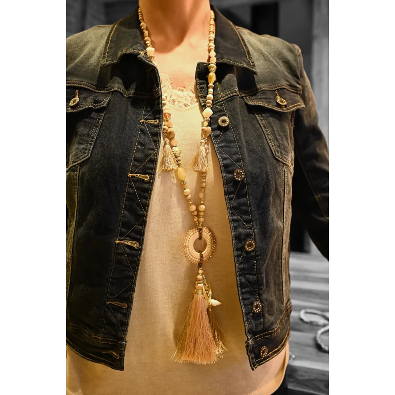 Dans une harmonie de teintes beiges, ce collier sautoir de 65 cm est un véritable éloge au charme bohème chic. Les perles et les pierres fantaisie, dans un assortiment de nuances terreuses, créent un effet visuel apaisant et chaleureux, parfait pour les journées ensoleillées et les soirées d'été. Le médaillon rond, élégamment ajouré et encadré de perles, sert de focal point, évoquant un talisman ancien. Les pompons, les breloques cœur, les pierres sélectionnées, les coquillages et les chaînes dorées ajoutent des dimensions de texture et d'intérêt, chaque élément contribuant à une esthétique riche et éclectique. Ce collier est l'accessoire idéal pour celles qui cherchent à exprimer leur individualité avec style, ajoutant une touche d'authenticité et d'insouciance à l'élégance quotidienne.