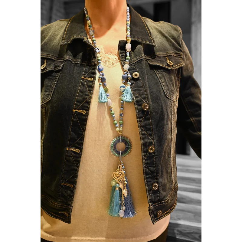 Ce collier sautoir de 65 cm, inspiré par la sérénité et la profondeur des océans, joue sur toute la gamme des bleus pour évoquer la tranquillité des eaux. Les perles et pierres fantaisie, choisies pour leur éclat et leur teinte bleue, rappellent les nuances changeantes de la mer, des azurs clairs des lagons tropicaux aux profonds indigos des abysses. Le médaillon central, un cercle délicatement ajouré et encerclé de perles, est une fenêtre sur le monde sous-marin, entouré de pompons qui évoquent la danse des vagues. Les breloques en forme de cœur, les pierres sélectionnées, les coquillages et les chaînes dorées ajoutent des touches de lumière et d'éclat, comme des trésors découverts dans le sable. Ce bijou est une invitation à porter la paix et la beauté de l'océan, ajoutant une touche d'élégance rafraîchissante à votre garde-robe.