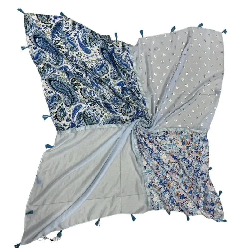 Ce foulard carré patchwork offre 4 faces différentes en un seul accessoire élégant. Composé de nuances de bleu avec des motifs variés comme des feuilles, il apporte une touche de sophistication à toute tenue. Fabriqué en 100% viscose et mesurant 140x140cm, ce foulard polyvalent allie confort et style pour un look tendance en toute saison.