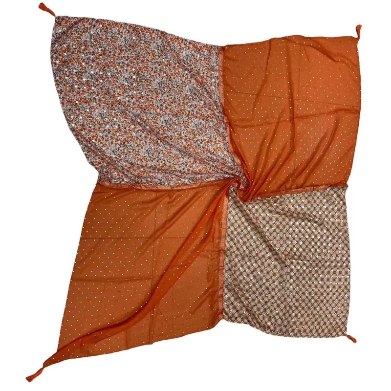Plongez dans l'univers de l'originalité avec notre foulard carré patchwork, un accessoire unique qui offre quatre visages distincts en un seul foulard. Chaque côté révèle un éclatant imprimé liberty, capturant des nuances chaudes et ensoleillées d'orange qui ajoutent une touche de vitalité à votre tenue. Avec ses dimensions généreuses de 140x140 cm et sa composition en viscose et coton, ce foulard allie à la fois douceur, légèreté et respirabilité pour un confort optimal tout au long de la journée.