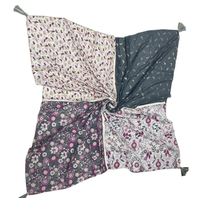Notre foulard carré patchwork représente un mélange parfait d'élégance et d'originalité. Avec ses quatre faces différentes, il présente des motifs délicats de plumes et de fleurs, dessinés dans des teintes subtiles de gris et de rose. Ce foulard, entièrement fabriqué en coton pour un confort optimal, mesure 140x140 cm, offrant une grande surface pour expérimenter avec différents styles de nouage. C'est l'accessoire idéal pour ajouter une touche de sophistication discrète à n'importe quelle tenue, tout en restant pratique et versatile.