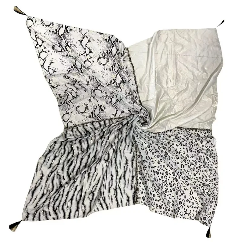 Découvrez notre foulard patchwork unique, conçu avec quatre faces distinctes pour un style versatile et audacieux. Ce modèle présente des imprimés exotiques comme le léopard et le zèbre en noir et blanc, offrant une touche de sophistication sauvage à votre garde-robe. Fabriqué en 100% viscose, ce foulard de 140x140 cm allie douceur et élégance, parfait pour ajouter une dimension dynamique à n'importe quelle tenue.