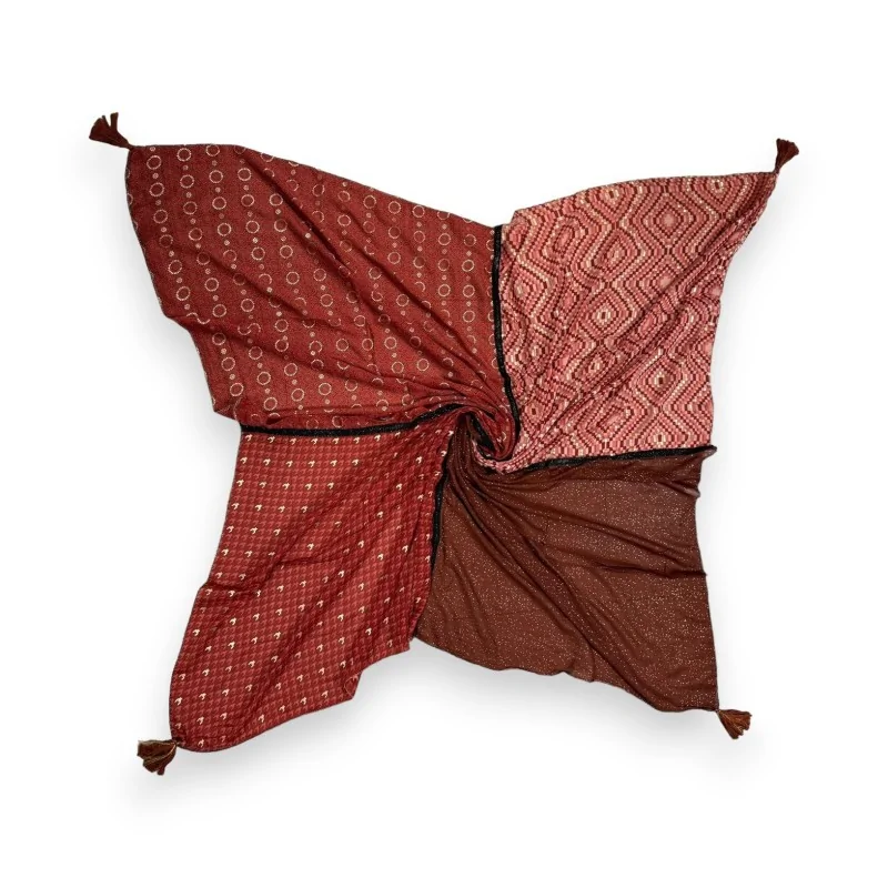 Plongez dans l'univers envoûtant de notre foulard carré patchwork aux motifs ethniques. Ce magnifique accessoire de 140x140cm offre un kaléidoscope de motifs géométriques et floraux dans des tons chauds de brique et de terre cuite. L'assemblage harmonieux des différents imprimés crée un effet patchwork original et captivant. Les motifs ethniques évoquent des inspirations tribales et bohèmes, insufflant une touche d'exotisme à votre garde-robe. La teinte brique dominante apporte chaleur et caractère, tout en restant facile à associer avec de nombreuses tenues.