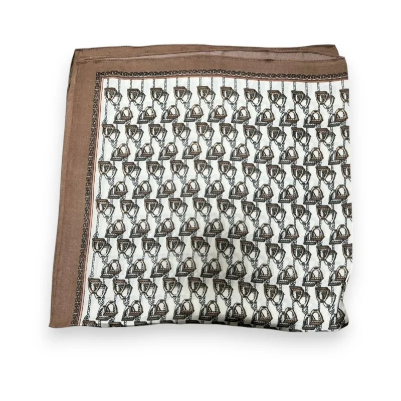 Le motif étrier qui orne ce foulard carré témoigne d'un savoir-faire artisanal exceptionnel. Disposés avec élégance sur un fond blanc immaculé, les étriers s'entrelacent harmonieusement, créant un motif répétitif sophistiqué. La bordure taupe apporte une touche de contraste raffinée et souligne la géométrie du dessin. Cette composition visuelle équilibrée fait de ce foulard un accessoire qui capte subtilement l'attention sans jamais être ostentatoire.