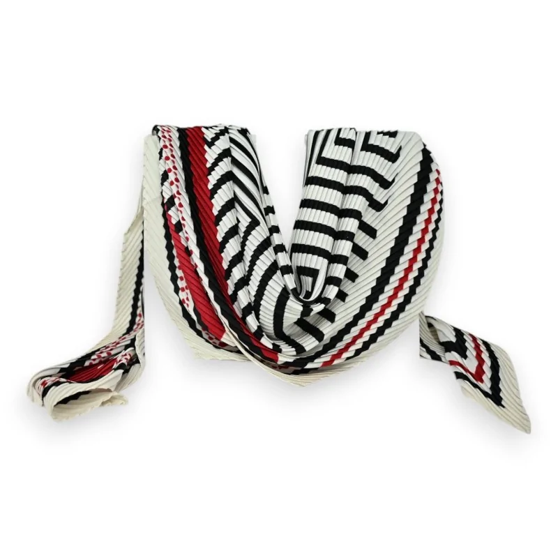 Ce foulard carré plissé se distingue par son motif rayé noir et blanc d'une grande modernité. Le plissé régulier apporte texture et mouvement, tandis que les touches de rouge viennent dynamiser l'ensemble avec élégance. Les dimensions généreuses de 90x90cm permettent de multiples possibilités de nouage, s'adaptant à tous les styles vestimentaires. Le travail minutieux des plis crée un effet tridimensionnel sophistiqué qui capte la lumière et anime ce carré aux lignes géométriques.