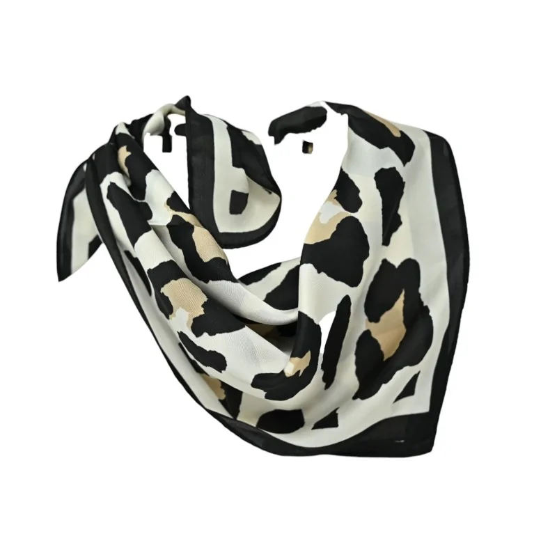 L'imprimé léopard, réalisé dans des tons harmonieux de noir et beige sur fond blanc, apporte une touche de caractère à cet accessoire. La bordure noire encadre élégamment le motif et renforce la structure visuelle du foulard. Cette composition graphique équilibrée permet de porter la pièce aussi bien de manière casual que sophistiquée.