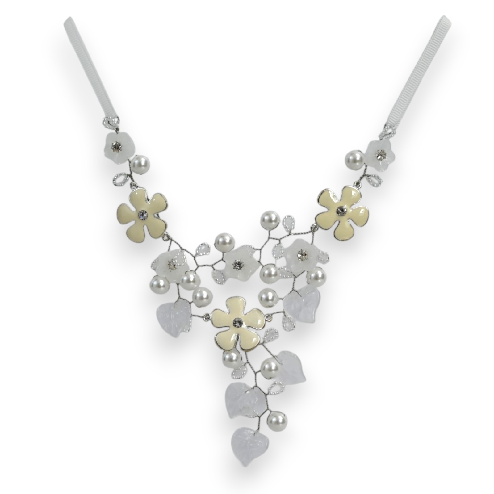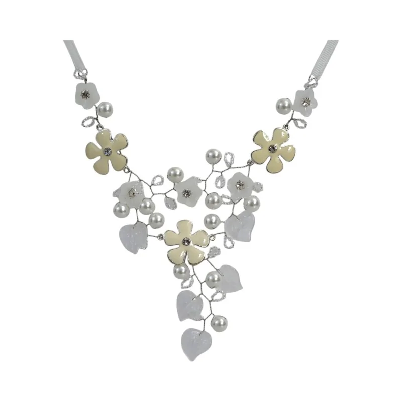 Ce collier fantaisie incarne l'alliance parfaite entre l'esprit bohème et l'élégance contemporaine. Sa composition associe harmonieusement des fleurs délicates en métal argenté et ivoire, créant un motif aérien qui sublime le décolleté. Les perles délicates ponctuent la composition avec grâce, tandis que le ruban en satin blanc apporte une touche de douceur supplémentaire. La finition argentée du fermoir et des détails métalliques confère à l'ensemble une préciosité moderne.