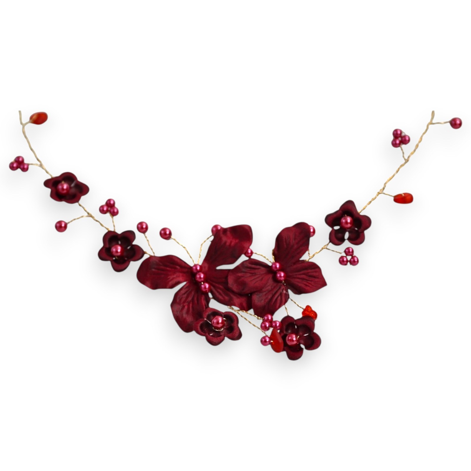L'intensité de la teinte bordeaux qui habille ce collier en fait un accessoire particulièrement sophistiqué. Les papillons en tissu, méticuleusement façonnés, s'entourent de petites fleurs assorties et de perles fantaisie brillantes qui captent et réfléchissent délicatement la lumière. Chaque élément est disposé sur une structure filaire dorée qui serpente avec grâce, créant un motif organique et naturel. Cette composition florale bordeaux profond s'harmonise parfaitement avec le métal doré, offrant un contraste riche et élégant qui sublimera aussi bien les tenues claires que les toilettes plus sombres.