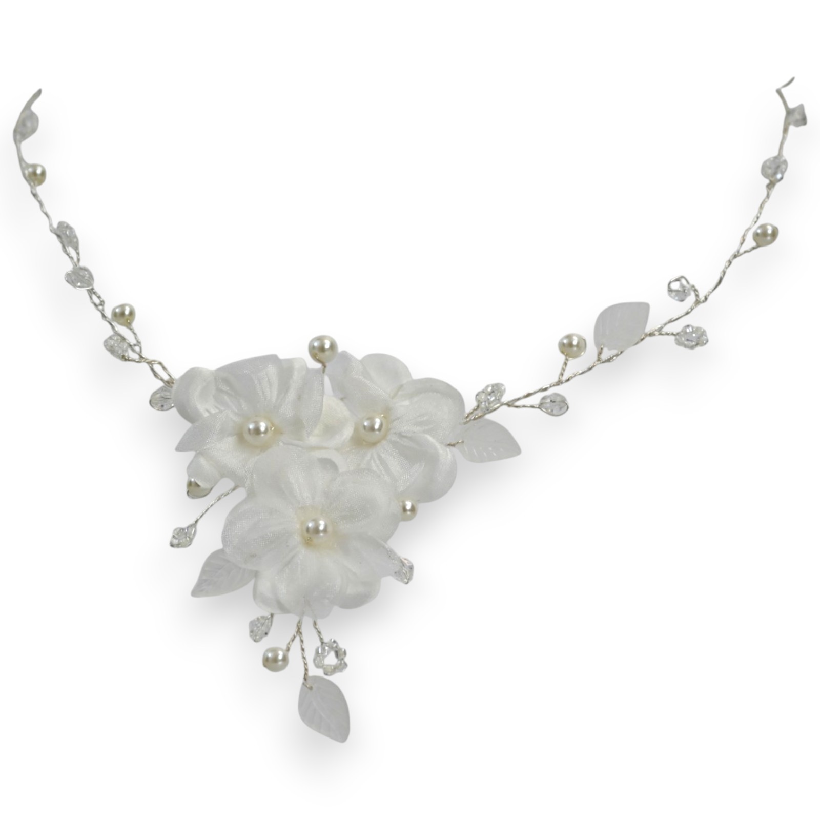 Véritable pièce d'artisanat, ce collier associe élégance et raffinement grâce à son bouquet central de fleurs en tissu et ses perles fantaisie de différentes tailles harmonieusement disposées. Sa finesse et sa grâce naturelle en font l'accessoire idéal pour sublimer une tenue de mariée, de demoiselle d'honneur ou pour toute occasion spéciale.