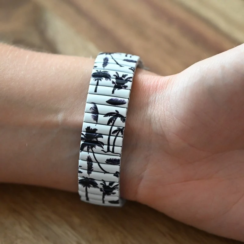 La montre "Ernest" se distingue par ses motifs tropicaux audacieux en noir et blanc. Majoritairement orné de palmiers, ce design donne à la montre un aspect à la fois élégant et exotique. Au-delà de son esthétique attrayante, ce magnifique garde-temps est d'une praticité inégalée grâce à son bracelet élastique. Conçu pour s'adapter à toutes les tailles de poignet, ce bracelet offre un confort inégalé, faisant de la montre "Ernest" le choix parfait pour un usage quotidien. Sa combinaison d'un design chic et d'une fonctionnalité adaptée au jour le jour en fait un accessoire indispensable pour ceux qui cherchent à allier style et commodité.