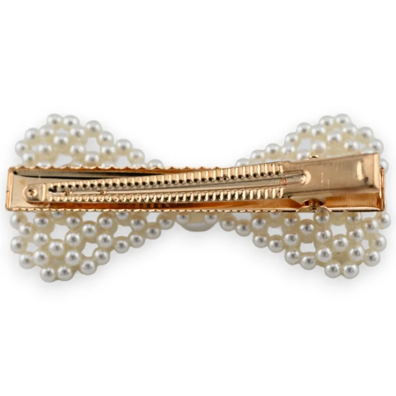 Cette élégante pince à cheveux, d'un doré éclatant, arbore un design sophistiqué en forme de nœud, entièrement orné de perles de couleur écru. Ces perles finement sélectionnées tissent un tableau de grace et de raffinement, évoquant une époque où la minutie et le soin apportés aux accessoires de mode étaient le reflet d'un savoir-faire artisanal d'exception. Au centre de ce nœud délicatement assemblé se trouve une perle de taille imposante, également teintée d'un écru chaleureux, qui attire le regard et captive l'attention. Cette perle centrale, telle une pièce maîtresse, apporte non seulement un point focal à l'ensemble mais aussi une touche de sophistication supplémentaire. La pince elle-même est conçue pour être aussi fonctionnelle qu'esthétique, permettant de maintenir les cheveux en place avec une assurance tranquille, sans sacrifier l'élégance. Avec ses 8 centimètres de dimension, elle est parfaitement proportionnée pour embellir une coiffure sans l'alourdir, ajoutant juste ce qu'il faut de présence sans être envahissante.