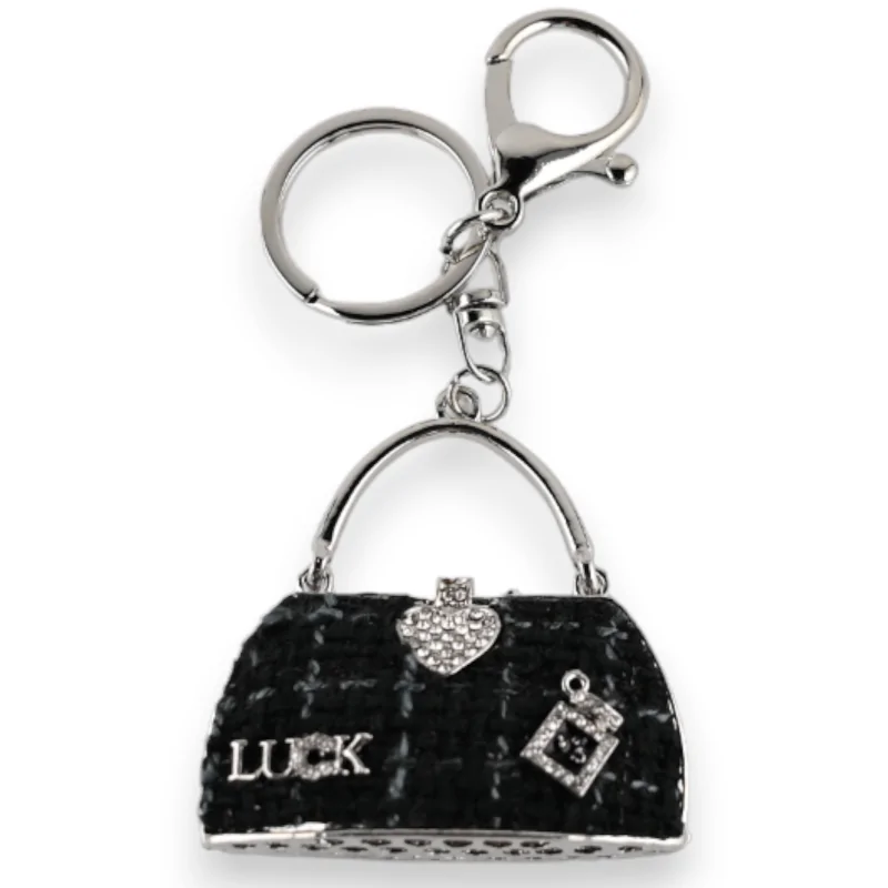 Ce porte-clé raffiné en argent évoque le monde de la mode à travers une représentation élégante d'un sac à main chic. Le sac, avec sa texture en tissu noir et gris, présente un relief palpable qui le rend presque vivant. L'attention aux détails est manifeste : le fermoir en forme de cœur, délicatement scintillant, se pare de lumière sur les deux faces du sac, le faisant briller de mille feux. De plus, des illustrations mode embellissent davantage la surface du sac, accentuant son caractère trendy. Sans son attache, ce bijou de sac mesure 5,5 cm, offrant une touche d'élégance à tout trousseau de clés ou sac à main.