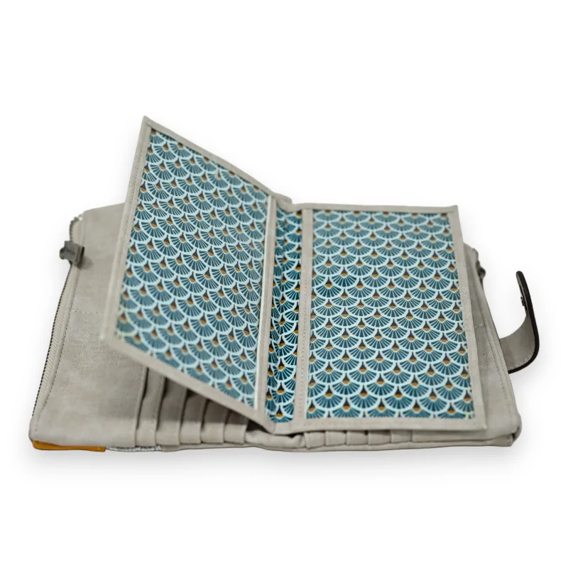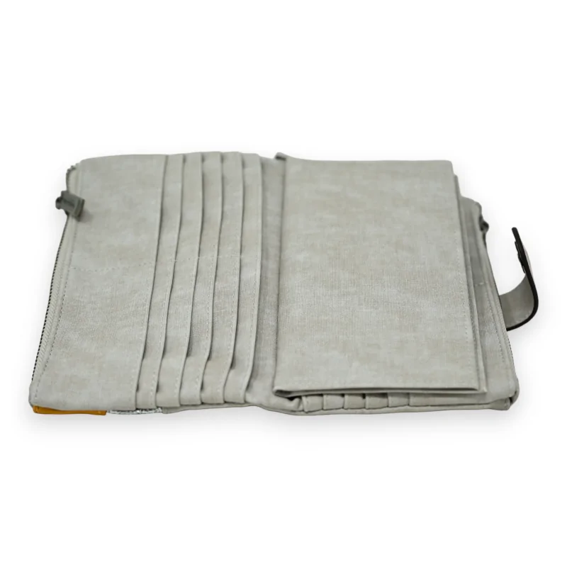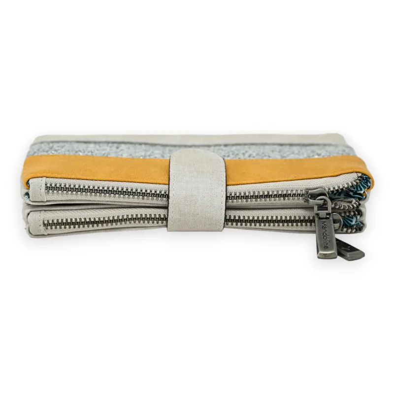 Offrez-vous une touche d'élégance fonctionnelle avec ce portefeuille compagnon au design raffiné. La couleur dominante, un gris clair apaisant, est magnifiquement contrastée par une bande inspirée du moutarde et une seconde bande argentée, ajoutant une dimension visuelle unique à l'ensemble. Son mécanisme d'ouverture magnétique ouvre sur un espace interne bien pensé, doté de multiples rangements astucieux, y compris un compartiment dédié au chéquier, garantissant que tout est à sa place. Les deux poches zippées, situées aux extrémités, offrent des solutions de rangement supplémentaires pour la monnaie ou d'autres nécessités. Réalisé en une matière synthétique de premier choix qui mime le cuir à la perfection, ce portefeuille de dimensions 19x12 cm est l'accessoire indispensable pour garder vos affaires personnelles organisées avec style.