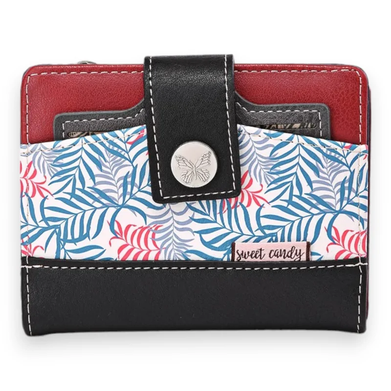 Découvrez le portefeuille et porte-monnaie de la marque Sweet & Candy, orné d'un superbe imprimé représentant une forêt tropicale dans des teintes de rouge et noir, avec des touches de couleurs pastel et douces. Ce modèle, à la fois pratique et compact, est parfait pour vous accompagner partout. Il comprend un compartiment pour les pièces avec fermeture éclair, un espace dédié aux cartes, une partie détachable pour encore plus de cartes, ainsi qu'un compartiment pour les billets. L'intérieur est doté de belles finitions, alliant élégance et fonctionnalité. Dimensions : 12,6 x 10 cm.