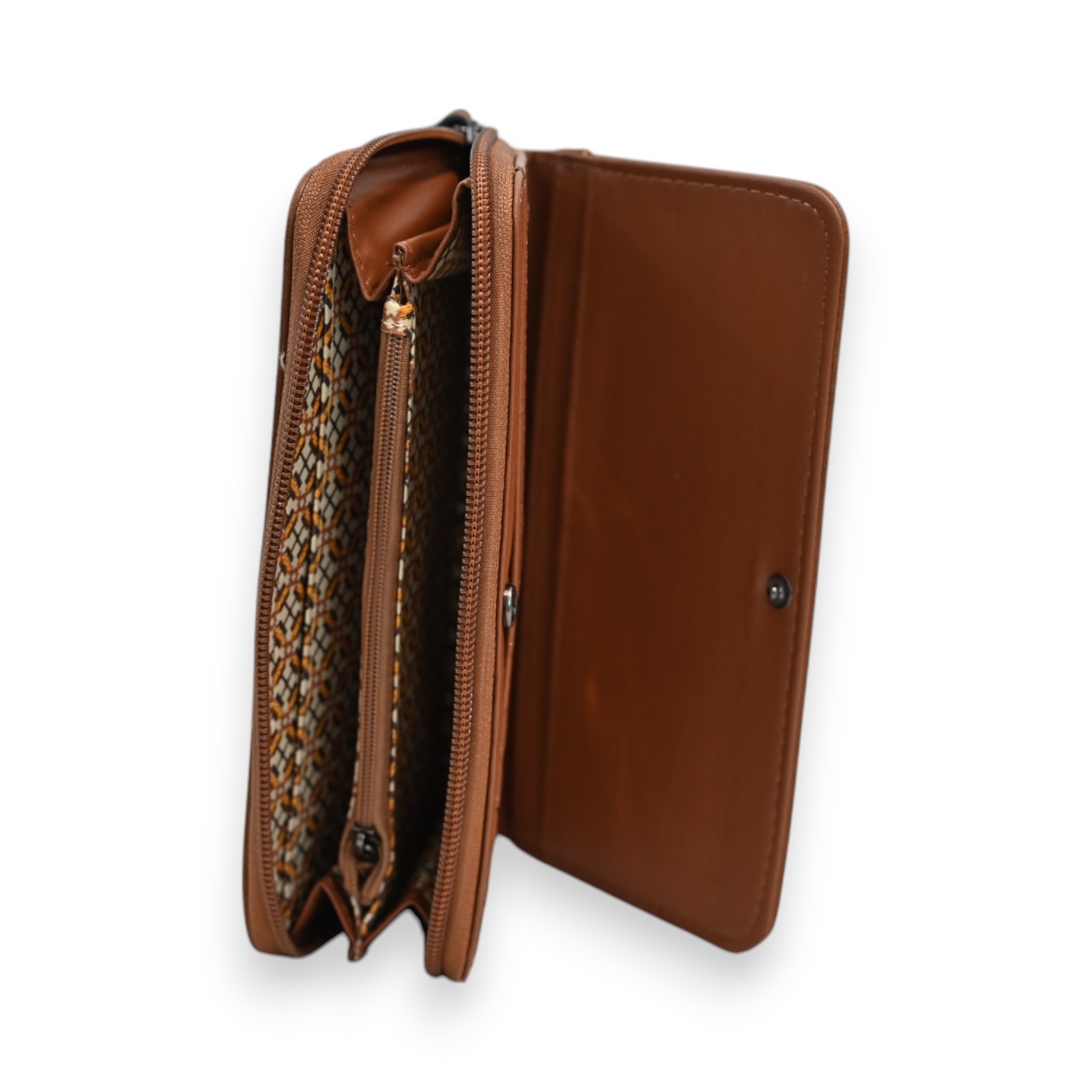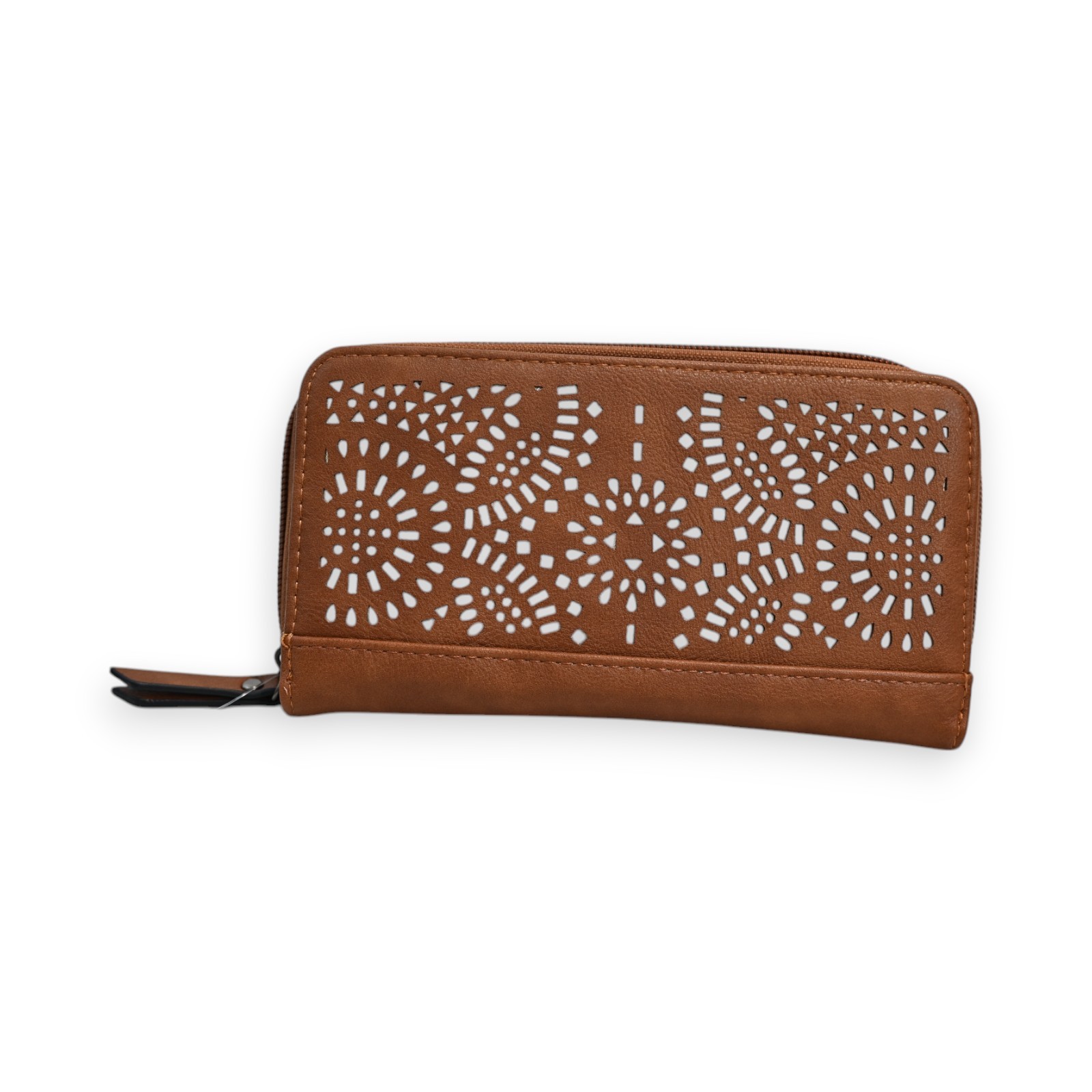 Le portefeuille Mélanie Paris allie style et praticité avec son design contemporain en synthétique camel sublimé par des motifs ajourés géométriques argentés. Sa conception ingénieuse offre deux espaces distincts : un compartiment à pression pour les cartes et documents, et une section zippée pour la monnaie et les billets.