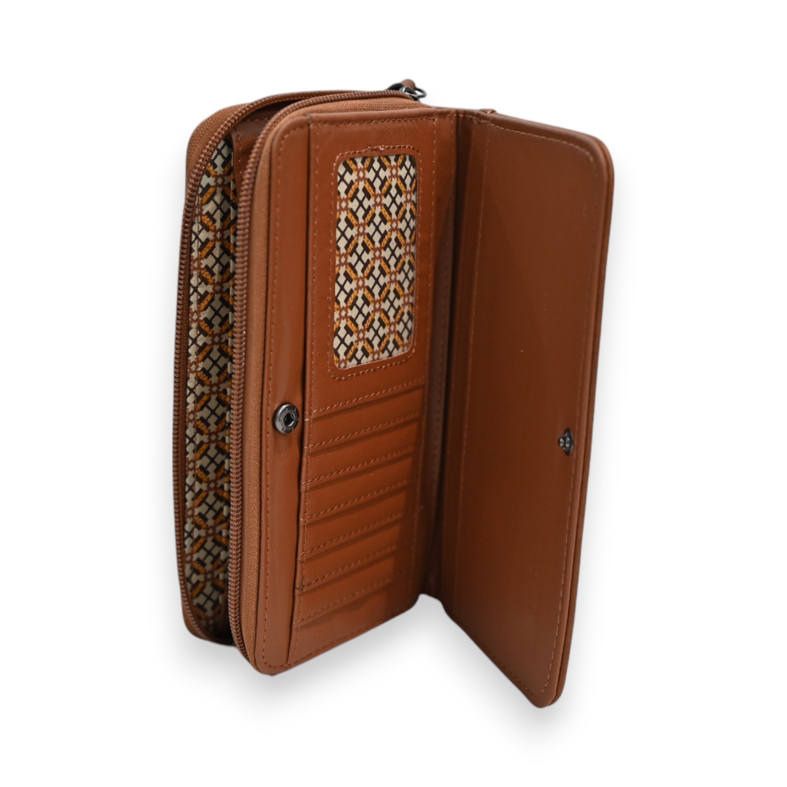Ce portefeuille élégant de la collection Mélanie Paris se distingue par son esthétique raffinée en coloris camel. La particularité de cet accessoire réside dans ses motifs ajourés géométriques argentés qui créent un jeu de lumière sophistiqué sur la surface du portefeuille. Cette finition travaillée apporte une touche de modernité tout en conservant une élégance intemporelle. La matière synthétique de haute qualité garantit une durabilité optimale tout en offrant un toucher agréable.