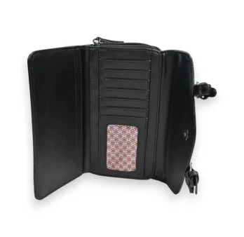 Le portefeuille Mélanie Paris incarne l'élégance parisienne avec son design sophistiqué en synthétique noir brillant. Sa conception intelligente combine style et fonctionnalité grâce à ses multiples compartiments et sa fermeture aimantée sécurisée. Les deux sangles décoratives sur le rabat ajoutent une touche distinctive à cet accessoire intemporel.