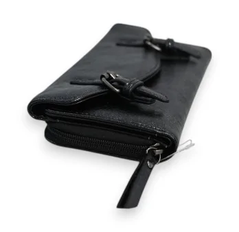 Le portefeuille Mélanie Paris se distingue par son allure sophistiquée en synthétique noir brillant qui capture parfaitement l'esprit du luxe accessible. Les deux sangles décoratives ornant le rabat principal confèrent à cet accessoire une signature visuelle unique, tandis que la fermeture aimantée assure une utilisation pratique et sécurisée. La finition brillante du matériau synthétique offre non seulement un aspect premium mais garantit également une durabilité optimale face aux utilisations quotidiennes.