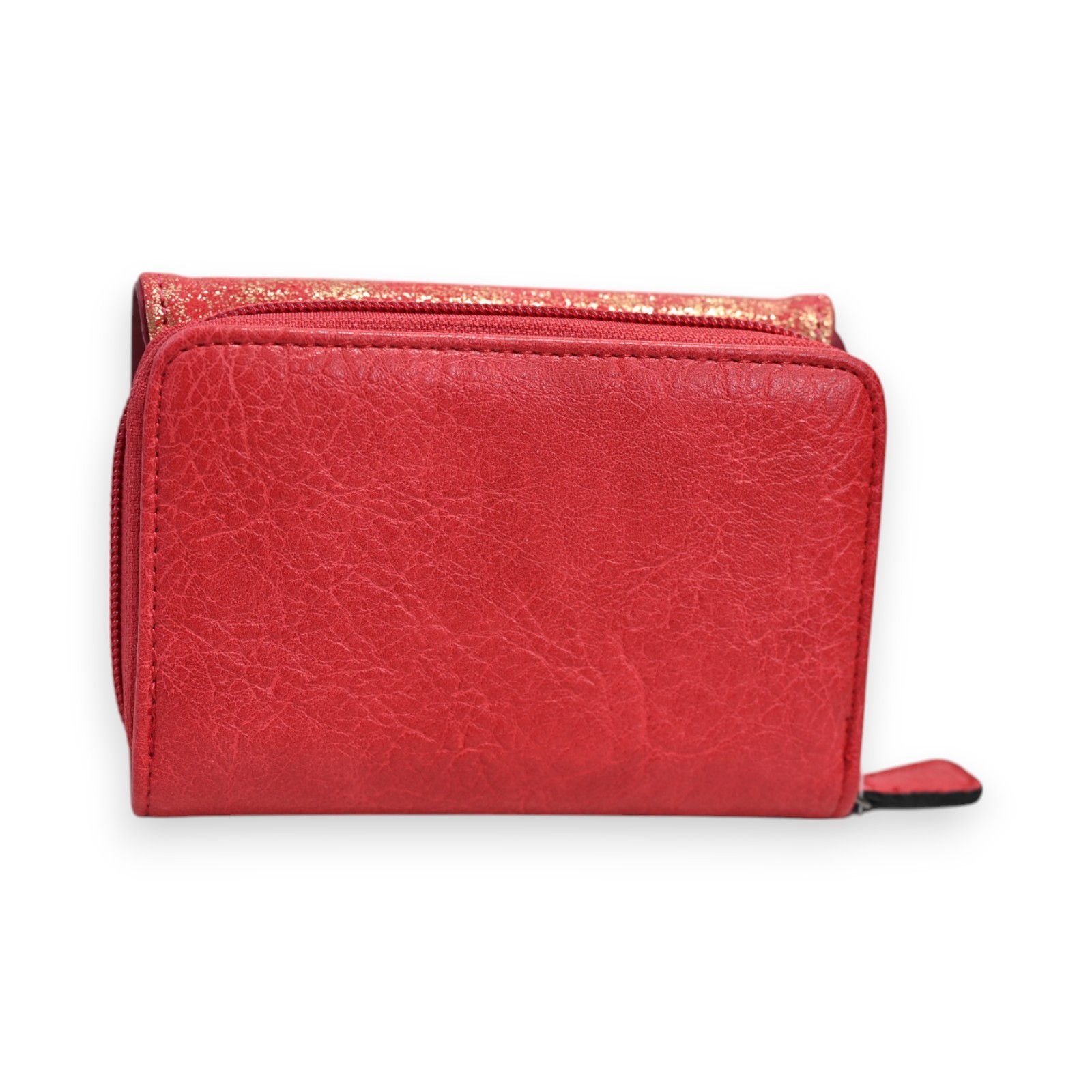 Ce portefeuille compact de la maison Mélanie Paris allie fonctionnalité et style avec son design bimatière rouge éclatant rehaussé de paillettes dorées sur le rabat. Son format optimal de 14x9x2,5 cm en fait l'accessoire idéal pour un usage quotidien.