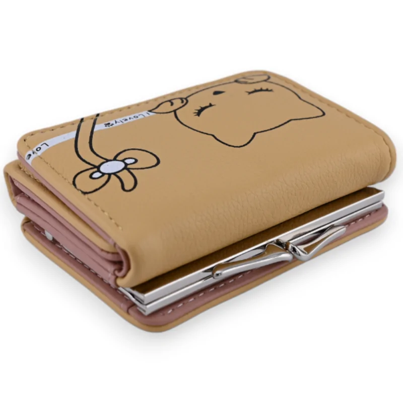 Découvrez notre portefeuille compact illustré d'un chat. Cet accessoire ingénieux vous offre une multitude de rangements : un espace pour vos billets, un compartiment dédié aux cartes et même une section avec un fermoir métallique argenté pour votre monnaie. Sa conception bicolore se démarque par une teinte moutarde à l'extérieur et un vieux rose élégant à l'intérieur. Petit mais malin, il répondra parfaitement à vos besoins de rangement.