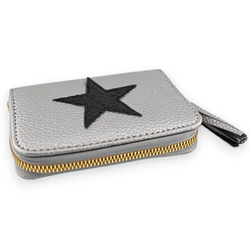 Le portefeuille étoile de couleur argent se distingue par son étoile noire qui apporte une brillance unique. Non seulement est-il agréable à regarder, mais ses nombreux compartiments pour billets et cartes le rendent également très pratique. Avec une taille de 14X10 cm, il se glisse aisément dans n'importe quel sac ou poche.