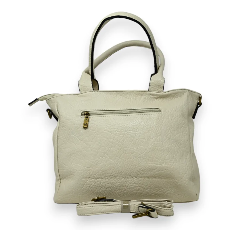 Ce sac à main Mélanie Paris allie élégance et praticité avec son design contemporain en synthétique beige. Ses dimensions généreuses de 45 x 29 x 14 cm offrent un espace de rangement optimal, sublimé par une poche frontale à rabat doré et une fermeture aimantée sophistiquée. La doublure intérieure au motif vintage apporte une touche de raffinement unique.