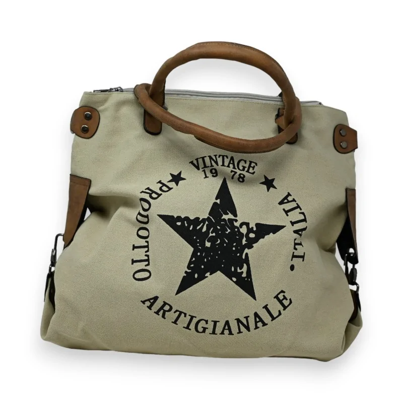 Découvrez le charme indéniable de ce sac à main vintage conçu dans un tissu épais. Son design élégant est rehaussé par une étoile noire centrale, entourée de motifs écrits assortis sur un fond beige attrayant. Les finitions en matière synthétique de couleur camel ajoutent une touche d'élégance, notamment avec une sangle de bandoulière assortie qui permet de varier les styles de port. Pour une adaptation rapide, le sac est équipé d'un crochet mousqueton de chaque côté, vous permettant de le raccourcir et de transformer son allure. Une poche zippée à l'arrière et une grande poche centrale, sécurisée par une fermeture éclair, offrent un espace généreux, complété par des poches plaquées sur les côtés pour une organisation optimale. Ce sac mesure 45 cm de large par 42 cm de haut, combinant fonctionnalité et style.