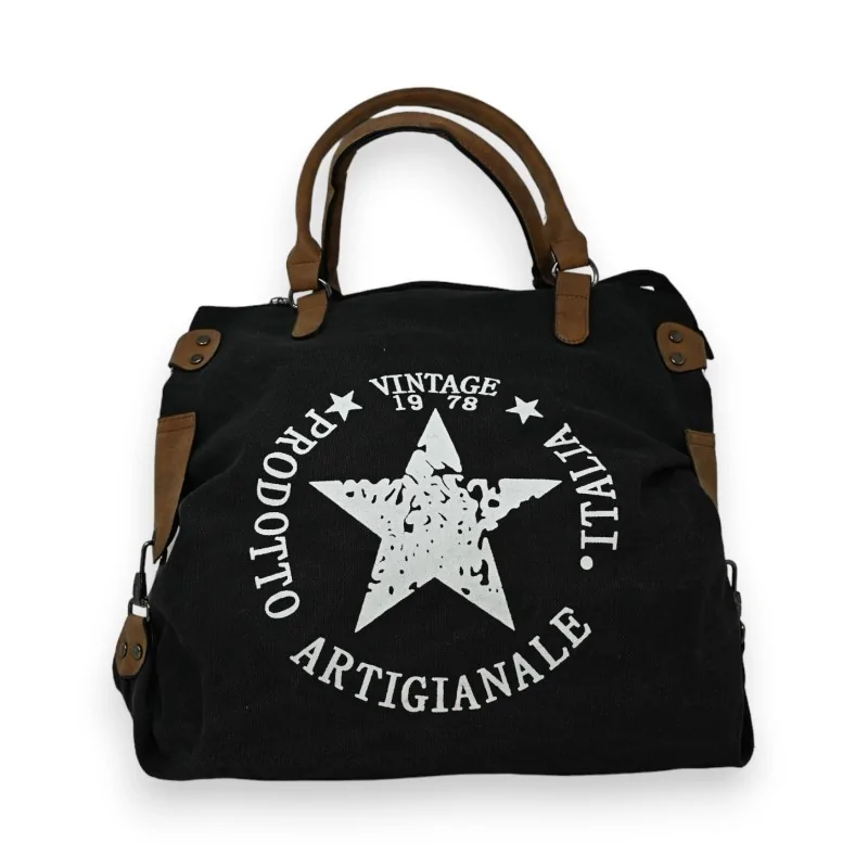 Le sac à main Vintage Star Artigianale représente l'essence même du savoir-faire italien. Son design distinctif met en valeur une imposante étoile blanche sur un fond noir profond, encerclée d'inscriptions vintage qui racontent son histoire. La mention '1978' évoque une époque où l'artisanat italien était à son apogée, tandis que le terme 'Artigianale' souligne sa fabrication authentique. Le contraste entre le noir du tissu épais et les finitions camel en matière synthétique crée une harmonie visuelle sophistiquée.
