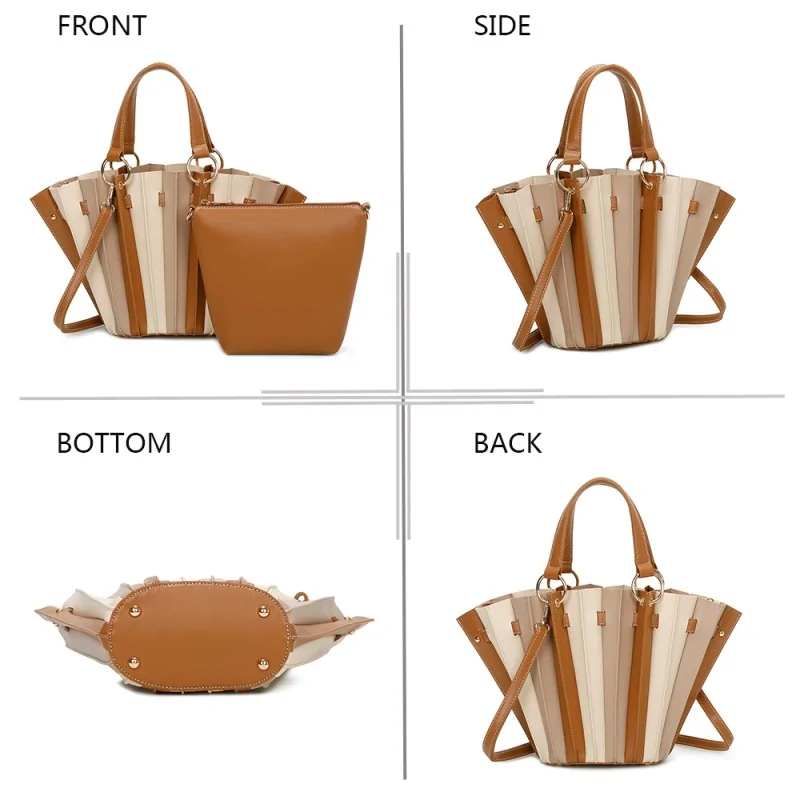 Ce sac à main plissé se démarque par son style unique et raffiné. Les plis verticaux créent un jeu de textures captivant, tandis que l'association des tons beige et caramel apporte une touche de sophistication. Sa forme évasée originale attire le regard et en fait un véritable accessoire de mode qui ne passera pas inaperçu. Les finitions soignées et les détails dorés ajoutent une note luxueuse à l'ensemble. Ce modèle saura rehausser vos tenues aussi bien de jour que de soirée.