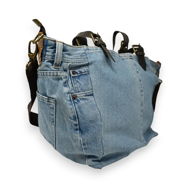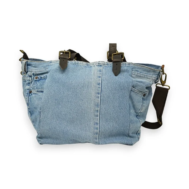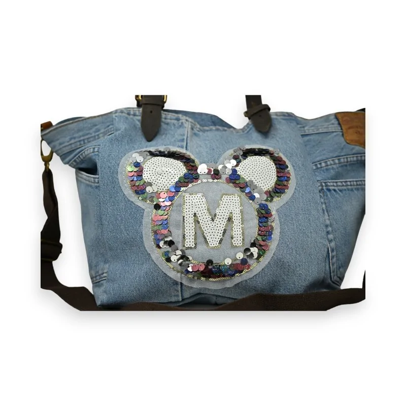 Ce sac à main Mandoline en jean clair est une pièce unique et originale qui ne passera pas inaperçue. Son atout charme : un grand imprimé en relief représentant des oreilles ornées de sequins et pastilles brillantes multicolores. Doté d'une bandoulière amovible et réglable en tissu ainsi que d'un poignet en cuir 100%, il allie style et praticité. Ses multiples poches intérieures et extérieures offrent un rangement optimal pour tous vos effets personnels. Avec ses dimensions de 50x29cm, ce sac spacieux deviendra vite votre allié mode au quotidien.