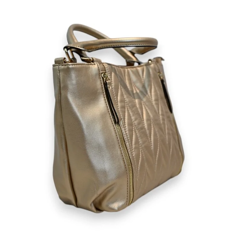 Le sac à main Mélanie Paris se distingue par son élégant matelassage géométrique qui orne sa face avant. Cette finition sophistiquée est mise en valeur par le revêtement synthétique doré qui capture et reflète la lumière avec subtilité. Les zips métalliques dorés s'harmonisent parfaitement avec l'ensemble, créant une cohérence visuelle remarquable. La doublure intérieure au motif vintage ajoute une touche rétro chic qui contraste délicieusement avec l'aspect moderne de l'extérieur.