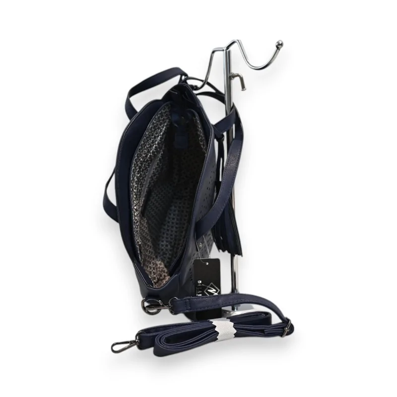Le sac à main Mélanie Paris se démarque par son motif mandala perforé sophistiqué qui orne sa face avant. Cette découpe laser précise crée un jeu de lumière subtil tout en apportant une touche artistique au design. La teinte bleu marine intemporelle s'accorde parfaitement avec toutes les tenues, du casual au plus habillé. Les finitions soignées, comme le pompon en cuir synthétique et les détails métalliques argentés, révèlent l'attention portée aux détails.