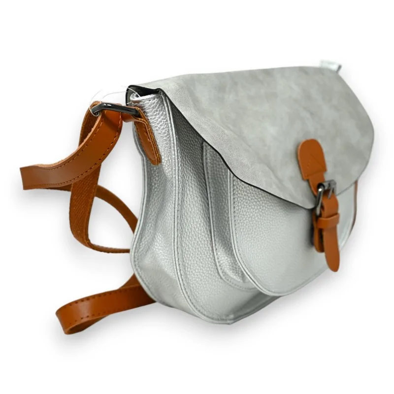 Le sac bandoulière Mélanie Paris allie élégance et fonctionnalité avec son design contemporain. Son rabat argenté brillant est sublimé par deux sangles camel aimantées qui apportent une touche de raffinement. La grande poche centrale offre un espace de rangement optimal, complété par des poches latérales pratiques dont une zippée pour plus de sécurité.