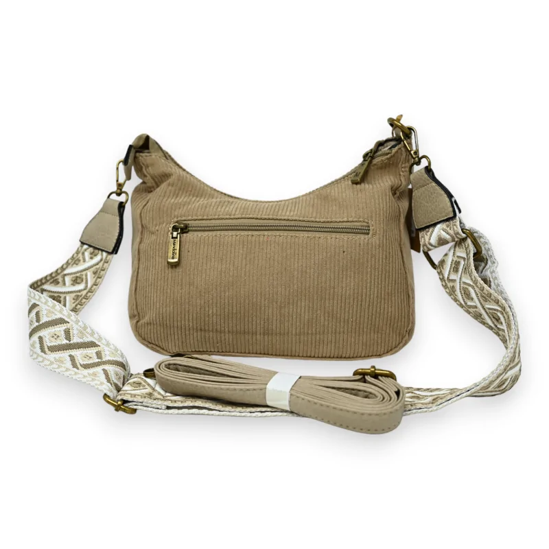 Ce sac bandoulière en velours couleur taupe est l'accessoire parfait pour ajouter une touche d'élégance à votre garde-robe. Les deux poches avant, dotées d'un système d'ouverture magnétique, offrent une touche de sophistication et de commodité, tandis que la grande poche intérieure, avec sa séparation centrale, assure une organisation sans effort de vos affaires. Les poches plaquées à l'intérieur sont idéales pour garder vos objets personnels bien organisés. Une poche extérieure à l'arrière ajoute à la fonctionnalité globale du sac, offrant un espace de rangement supplémentaire facile d'accès. La sangle, ornée d'un tissu imprimé assorti et réglable, permet de personnaliser le sac à votre goût et à votre confort. Avec une taille de 31x20 cm, ce sac combine élégance, polyvalence et praticité, faisant de lui un choix privilégié pour toute occasion
