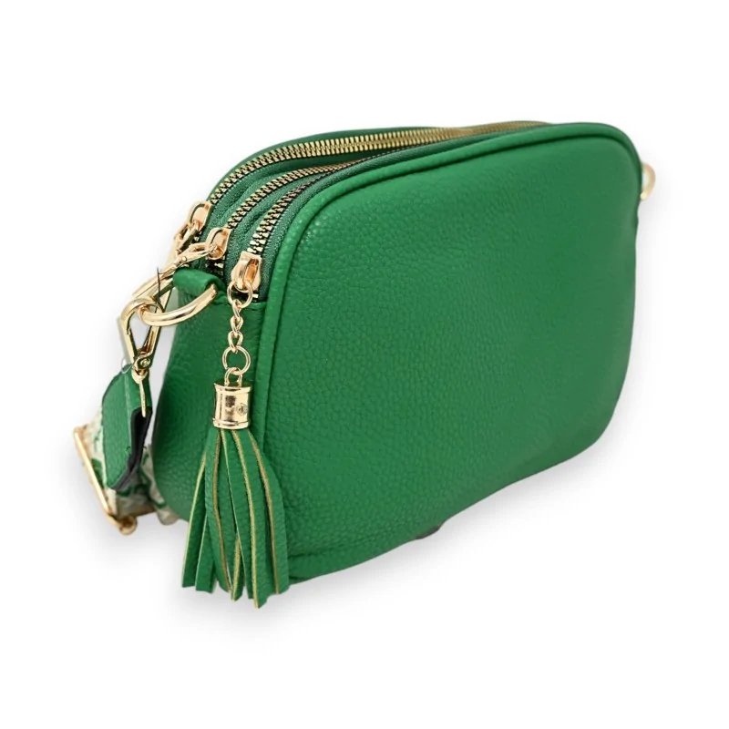 Ce sac bandoulière de couleur vert brésil apporte une touche de fraîcheur et de vivacité à tout ensemble. Fabriqué en matière synthétique de haute qualité, il présente une forme rectangulaire élégante qui combine à la fois style et fonctionnalité. Le sac dispose de trois poches frontales, chacune fermée par un zip robuste pour garantir la sécurité de vos biens. Une poche supplémentaire située à l'arrière offre un accès rapide à vos nécessités quotidiennes. Complétant ce design pratique, le sac est équipé d'une sangle bandoulière réglable confectionnée dans un tissu imprimé, mêlant des tons de beige et de vert brésil, qui assure un confort et une adaptation parfaite à votre taille. Avec ses dimensions pratiques de 23 cm de largeur par 17 cm de hauteur, ce sac est idéal pour une utilisation quotidienne, alliant praticité et esthétique moderne.