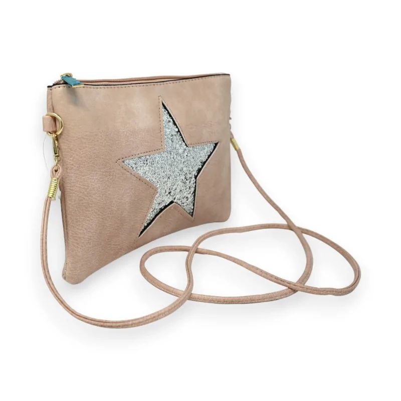 Optez pour une touche de délicatesse avec ce sac pochette bandoulière en synthétique de couleur vieux rose. En son cœur, il arbore une étoile argentée brillante, un détail qui ajoute une élégance instantanée à cet accessoire. Pratique tout en étant stylé, il est doté d'une poche centrale zippée pour un rangement sécurisé de vos essentiels tels que téléphone, clés et portefeuille. La sangle fine, réglable, permet un port confortable soit en bandoulière, soit sur l'épaule, offrant ainsi une polyvalence adaptée à toutes occasions. Avec ses dimensions de 23 cm par 16 cm, ce sac combine commodité et chic, parfait pour les sorties où seule l'élégance est invitée.